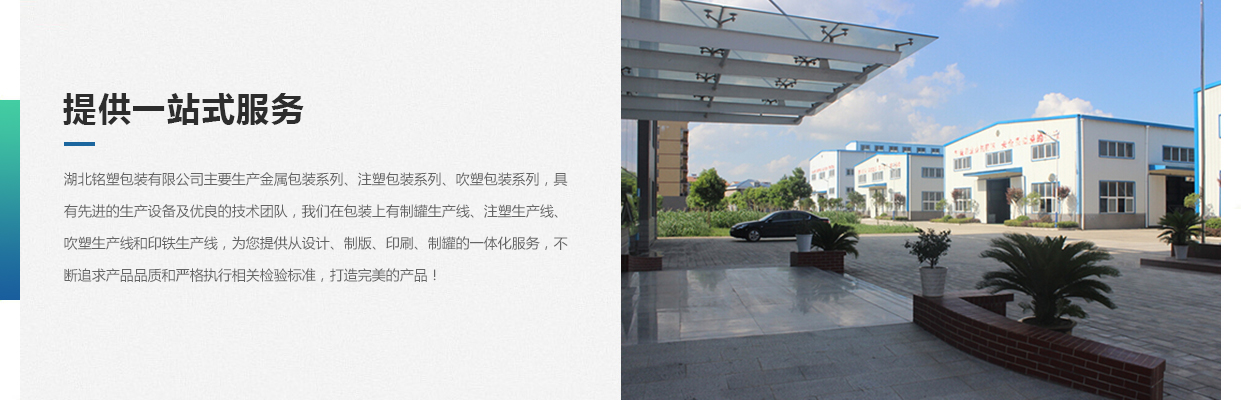 湖北銘塑包裝有限公司一家集研發、生產、銷售于一體的較優秀民營企業,技術力量雄厚,產品質量可靠。位于交通暢順,百業興旺、經濟富裕、政策開放的孝感開發區域。我們企業的營銷戰略是以建筑為土壤,以產品為種子,以質量為肥料,讓綠色鋪滿全球。憑借多年來的行業經驗,公司不斷進行創新和研發,為市場提供更廣泛的產品應用領域和更好環保節能產品,為國家能源環保戰略和可持續發展戰略作出應有的貢獻。     湖北銘塑包裝有限公司主要生產金屬包裝系列、注塑包裝系列、吹塑包裝系列,具有先進的生產設備及優良的技術團隊,我們在包裝上有制罐生產線、注塑生產線、吹塑生產線和印鐵生產線,為您提供從設計、制版、印刷、制罐的一體化服務,不斷追求產品品質和嚴格執行相關檢驗標準,打造更好的產品!